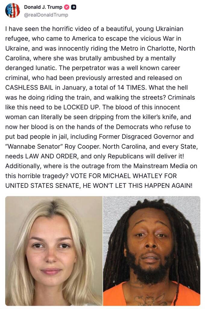 "Я бачив жахливе відео з молодою українською біженкою, яка приїхала до Америки, рятуючись від страшної війни в Україні. Вона, ні в чому не винна, перебувала у метро Шарлотти, Північна Кароліна, де на неї жорстоко напав чоловік із психічними проблемами. Злочинець був відомим професійним правопорушником, якого раніше арештовували та випускали під безготівкову заставу в січні, всього 14 разів. Чому він перебував у поїзді та вільно пересувався вулицями? Таких злочинців потрібно садити в тюрму. Кров цієї невинної жінки буквально капає з ножа вбивці, і тепер ця кров на руках демократів, які не бажають садити поганих людей у тюрму, в тому числі колишнього губернатора і «мрійника стати сенатором» Роя Купера. Північній Кароліні, як і кожному штату, необхідні закон і порядок, які можуть забезпечити тільки республіканці! І де ж обурення з боку великих ЗМІ з приводу цієї жахливої трагедії?", – написав президент США у своїй соцмережі.
