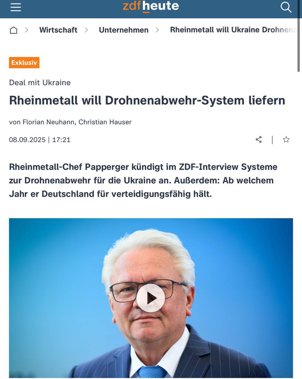 Таке повідомлення надійшло від голови Rheinmetall Паппергера. Йдеться про сучасні мобільні комплекси ППО Skyranger. Зенітна платформа встановлюється на базі танків Leopard і забезпечує знищення всіх дронів у зоні 4×4 км.