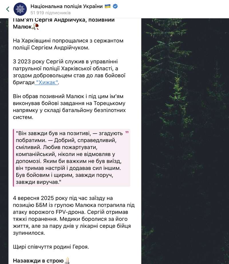 У Харківській області поховали поліцейського Сергія Андрійчука з позивним "Малюк", котрий загинув на Торецькому напрямку. Життя захисника обірвав ворожий дрон.