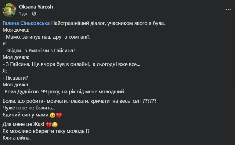 "Знову чорна звістка розриває серце матері через втрату єдиного синочка. З великим болем сповіщаємо про загибель молодого, кремезного красеня, гайсинчанина, солдата 423 окремого батальйону безпілотних систем "Скіфські грифони" Дуднікова Володимира Миколайовича, 1999 року народження", – йдеться в повідомленні.