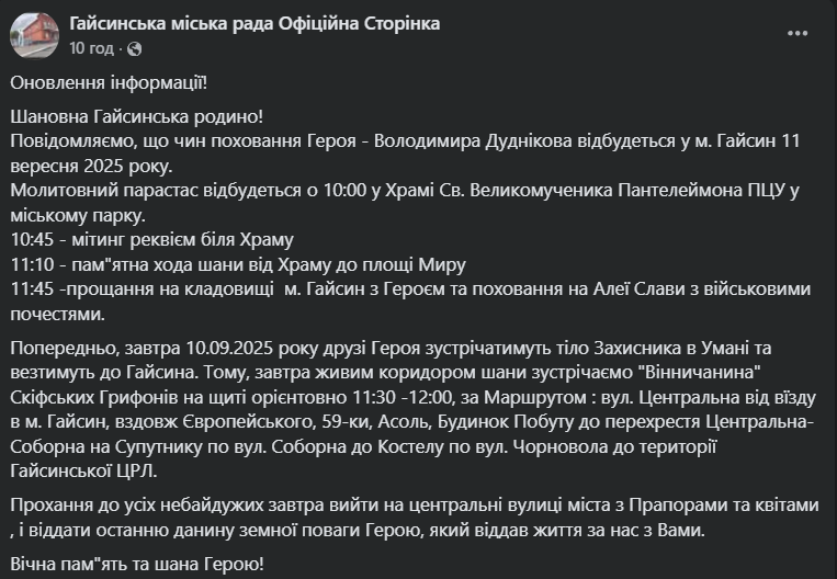Прощання з військовим відбудеться 11 вересня 2025 року у м. Гайсин.