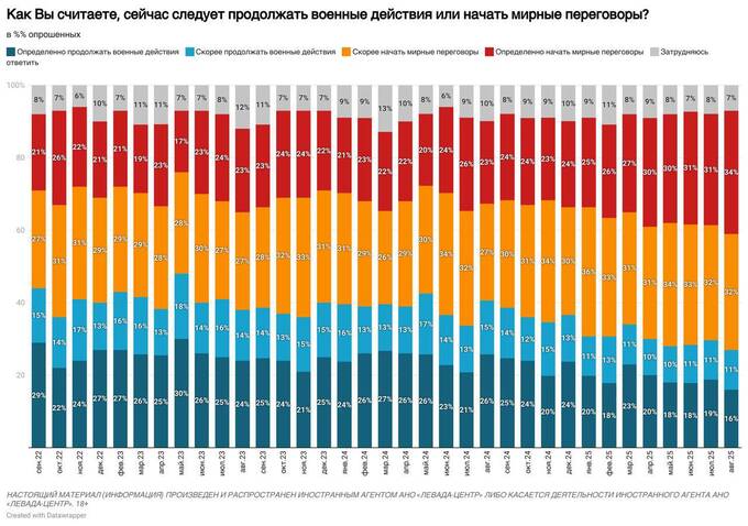 Порівняно з початком року провоєнно налаштованих росіян стало менше на 4 процентних пункти, а порівняно з серпнем 2024 — на 13 п. п. Частка респондентів, які вважають, що потрібно розпочинати мирні переговори, досягла 66% проти 61% у січні та 50% рік тому.