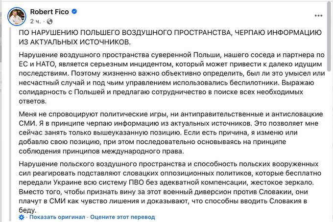 «Порушення повітряного простору Польщі та здатність польських військових реагувати ставлять перед словацькими опозиційними політиками, які безоплатно передали Україні всю систему протиповітряної оборони без адекватної заміни, жорстке дзеркало. Замість того щоб визнати свою вину за цей військовий саботаж проти Словаччини, вони кричать у ЗМІ, як божевільні, і доводять, що здатні лише занурити Словаччину в біду», - написав Фіцо.