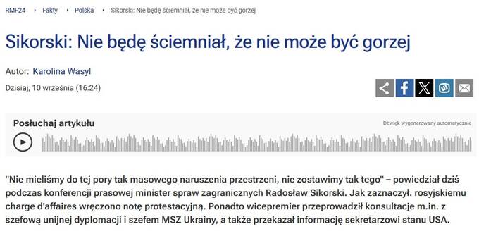 Про це повідомив міністр закордонних справ Польщі Сікорський.