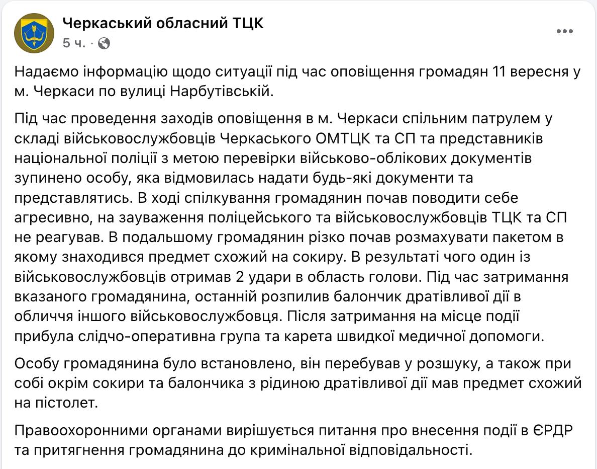 Черкаський обласний ТЦК повідомляє, що в Черкасах чоловік завдав удару сокирою по голові співробітникам військкомату, які його зупинили для перевірки документів, а також розпилив на них газ з балончика.