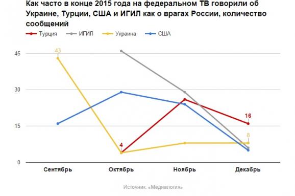 Компанія "Медіалогія" вивчила, як часто російські телеканали, ЗМІ та блоги в 2015 році згадували Україну, США, Туреччину і ІГІЛ у ворожому контексті, передає Еспресо.TV з посиланням на РБК.