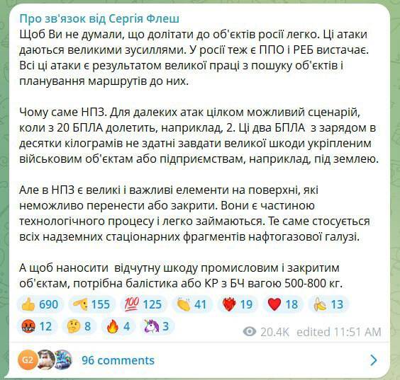 "Ці два безпілотники з вантажем у десятки кілограмів не можуть завдати серйозних пошкоджень укріпленим військовим об’єктам або підприємствам, таким як ті, що розташовані під землею. Але в нафтопереробних заводів є великі та важливі елементи на поверхні, які неможливо перемістити або сховати. Вони є частиною технологічного процесу і є легкозаймистими. Те саме стосується всіх наземних стаціонарних елементів нафто-газової галузі. А для завдання відчутної шкоди промисловим та захищеним об’єктам потрібні балістичні або крилаті ракети з боєзарядом вагою 500-800 кілограмів", - повідомляє «Флеш».