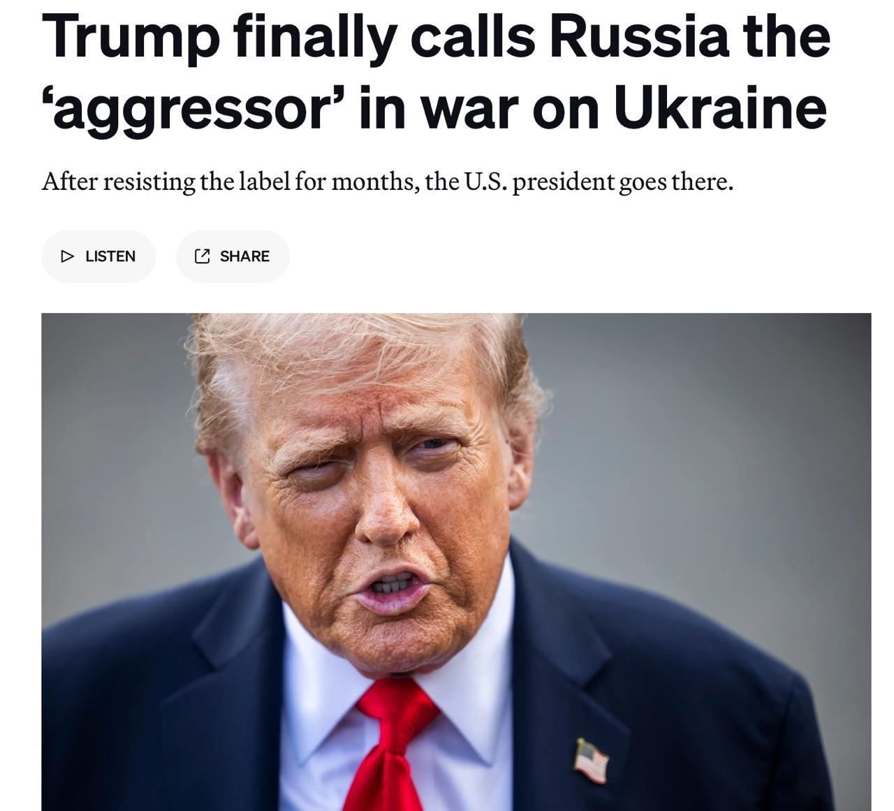 Трамп вперше заявив, що Росія є агресоркою у війні проти України, – Politico.