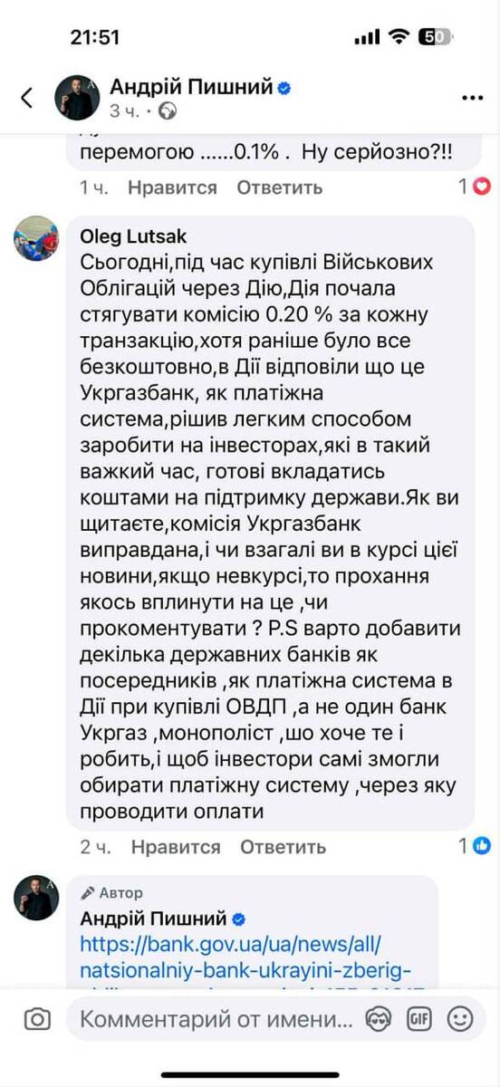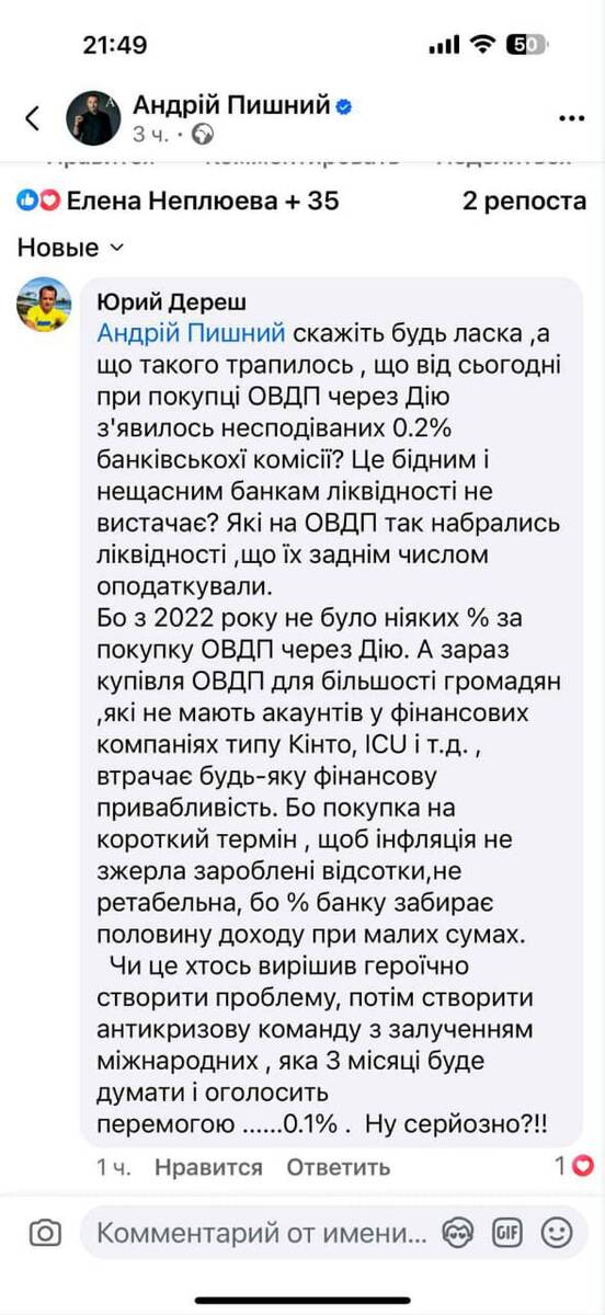 «Чому при купівлі ОВДП через "Дія" раптово з’явилася комісія у розмірі 0,2%? Невже банкам не вистачає ліквідності?» — запитав користувач Юрій Денеш.