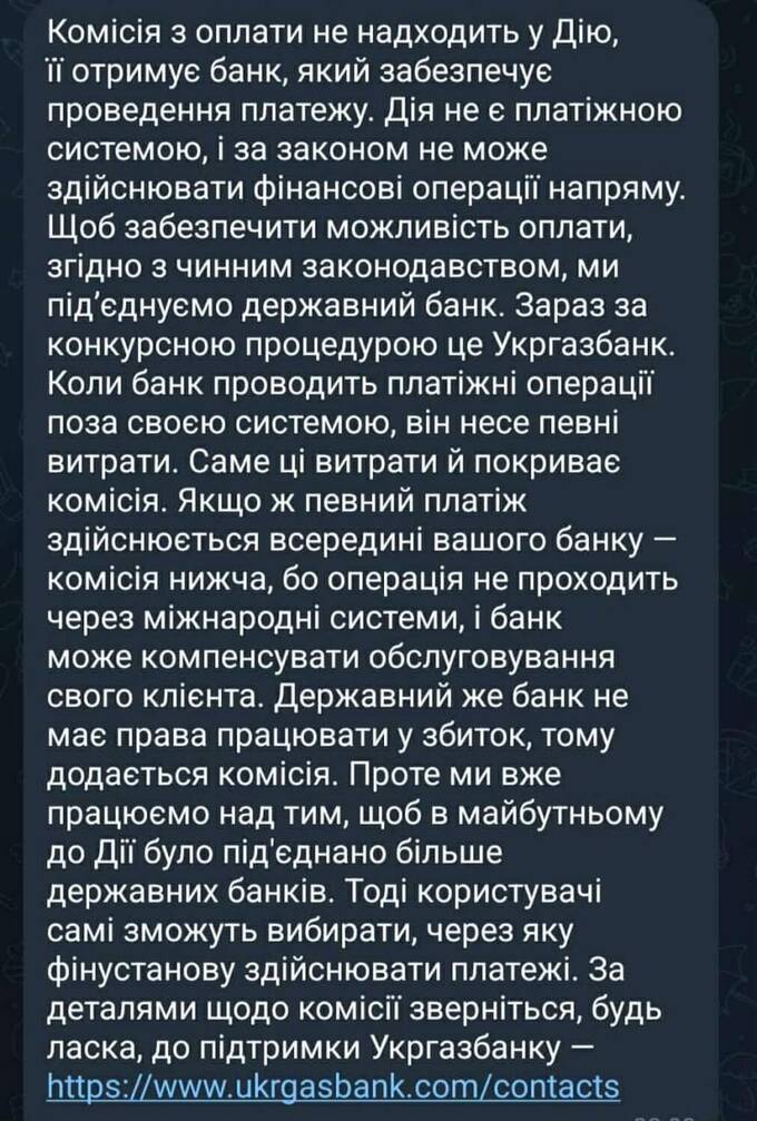«"Дія" не є платіжною системою і за законом не може здійснювати фінансові операції безпосередньо. Для забезпечення можливості оплати підключається державний банк, у такому випадку Укргазбанк. Банк несе певні витрати при проведенні платіжних операцій поза своєю системою, які й покриваються цією комісією», — пояснили в "Дія".