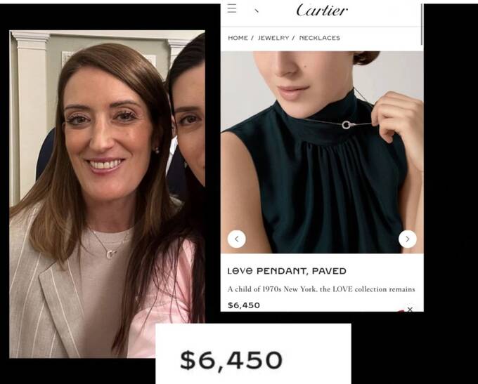 Президентка Європарламенту Роберта Мецола під час візиту до українського парламенту з’явилася у підвісці Cartier Love Pendant, вартість якої складає $6 450.