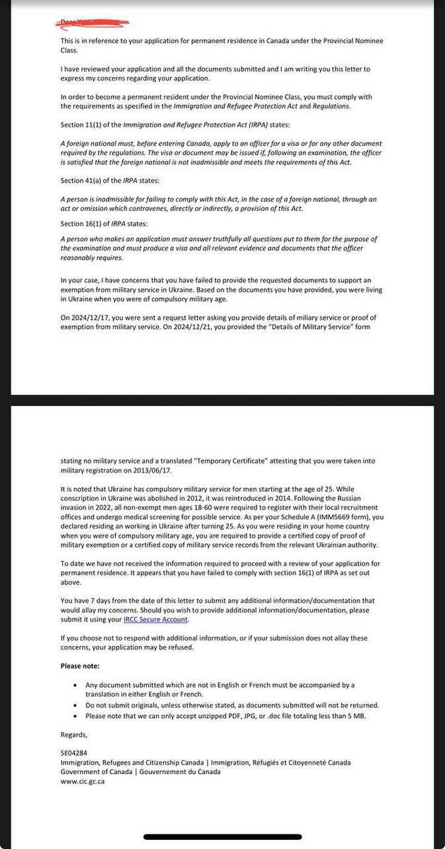 Також у публікації поділилися листом, отриманим одним із їхніх читачів. Це лист було надіслано офіцером після того, як заявник попередньо відповів на додатковий запит, що стосувався інформації про військову службу чи її відсутність (military records form), та надав приписне свідоцтво й пояснення про те, що він ніколи не служив і не був призваний. Однак це не задовольнило канадського імміграційного офіцера.