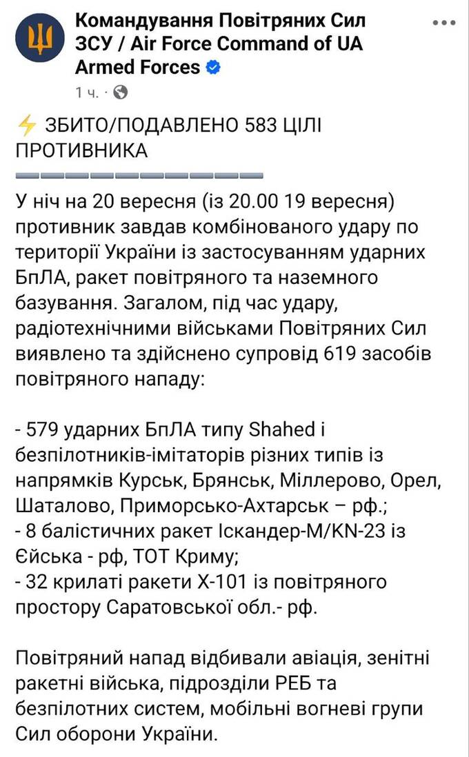 - 579 ударних "шахедів" і дронів-імітаторів (552 з них були збиті або придушені);