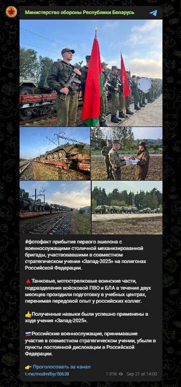 Міноборони Білорусі повідомляє, що всі російські військові, які брали участь в навчаннях "Запад-2025", повернулися в Росію.