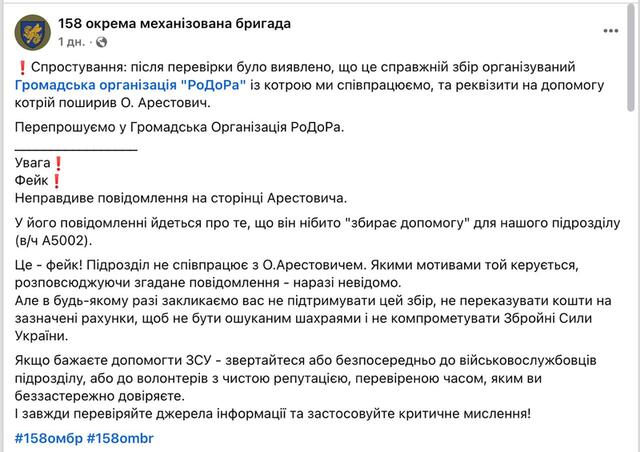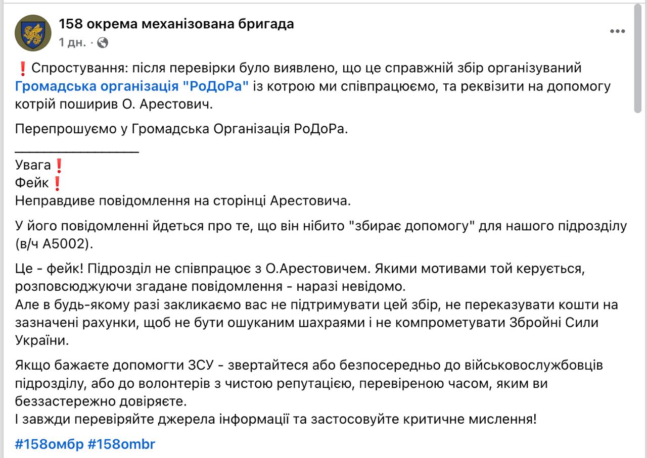 "Після перевірки виявили": 158-ма бригада підтвердила, що Арестович збирає для них гроші