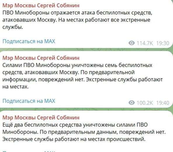"Силами ППО Міноборони знищено сім безпілотних засобів, які атакували Москву. За попередньою інформацією, пошкоджень немає. Екстрені служби працюють на місцях", — написав він у Telegram.
