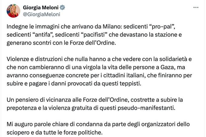 «Соромницькі кадри з Мілана: ті, хто називають себе «пропалестинцями», «антифашистами», «пацифістами», руйнують вокзал і конфліктують з правоохоронними органами. Насильство і руйнування, що не мають нічого спільного з солідарністю і не впливають на життя людей у Газі, але призводять до реальних наслідків для італійських громадян, які в кінцевому підсумку страждатимуть і розплачуватимуться за шкоду, завдану цими порушниками», - зазначила Мелоні в Х.