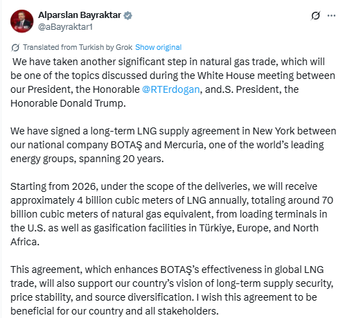 Відповідну угоду між турецькою енергетичною компанією BOTAŞ та однією з найбільших незалежних інтегрованих енергетичних і товарних груп Mercuria підписали генеральний директор BOTAŞ Абдулвахіт Фідан і президент Mercuria Даніель Йеггі в Турецькому домі в Нью-Йорку. Про це у своєму X повідомив міністр енергетики та природних ресурсів Туреччини Алпарслан Байрактар.