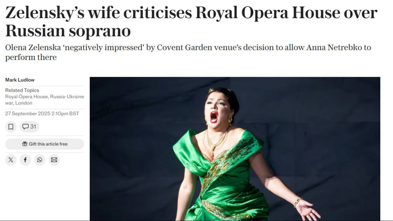 Олена Зеленська висловила невдоволення рішенням Королівського оперного театру зберегти виступи співачки-сопрано Анни Нетребко, яку «деякі вважають найкращою у світі».