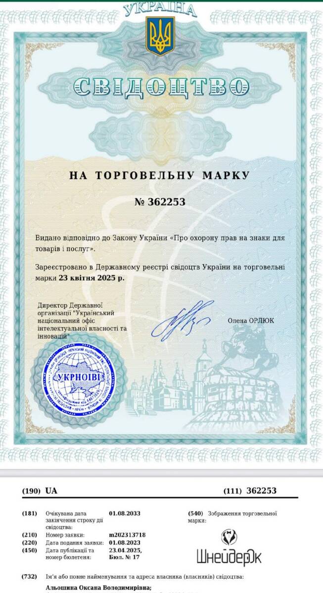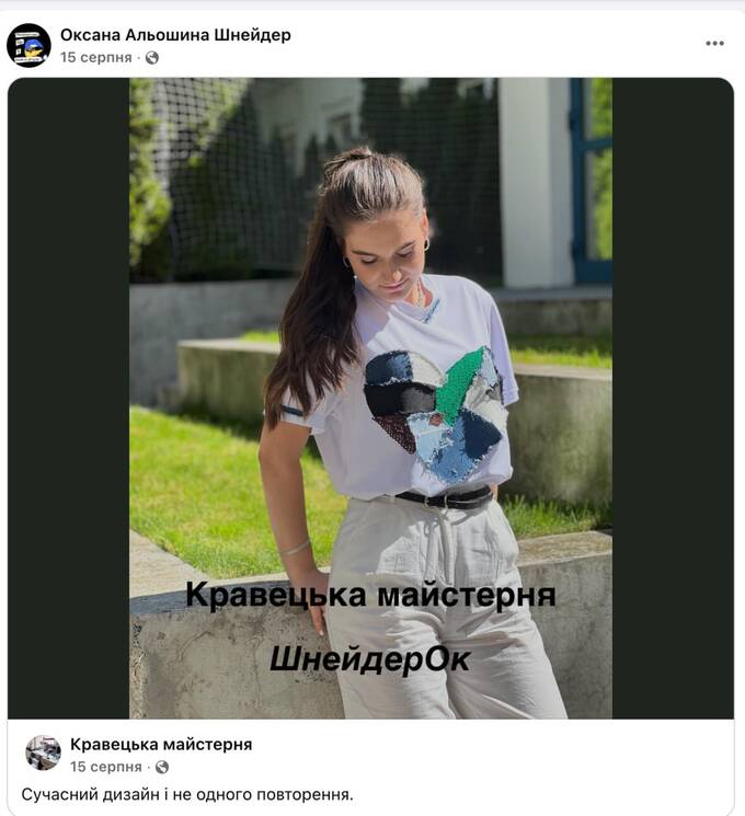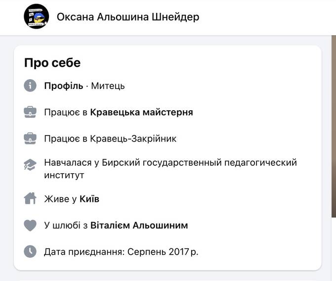 Оксана Альошина (Шнейдер) володіє двома кравецькими майстернями на Київщині та займається виготовленням одягу, а нещодавно зареєструвала бренд "ШнейдерОк". При цьому жодних доходів у декларації не вказано. У пана Альошина ще є час подати виправлену декларацію про майно.