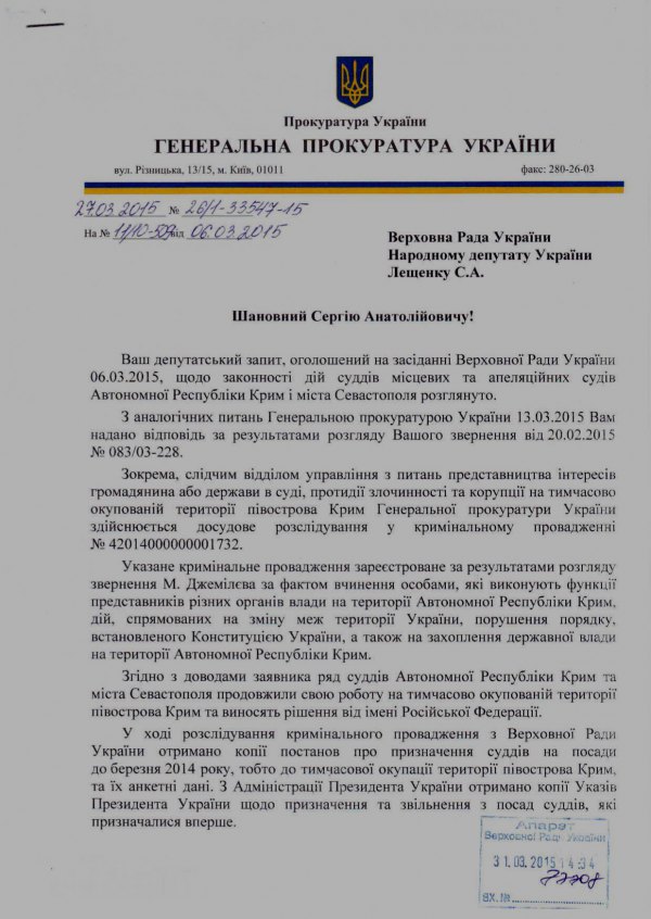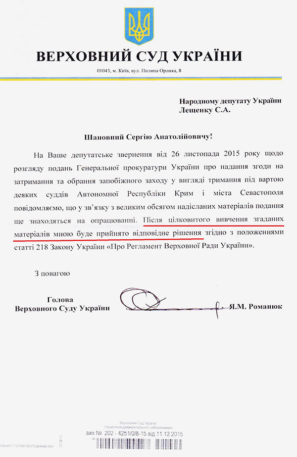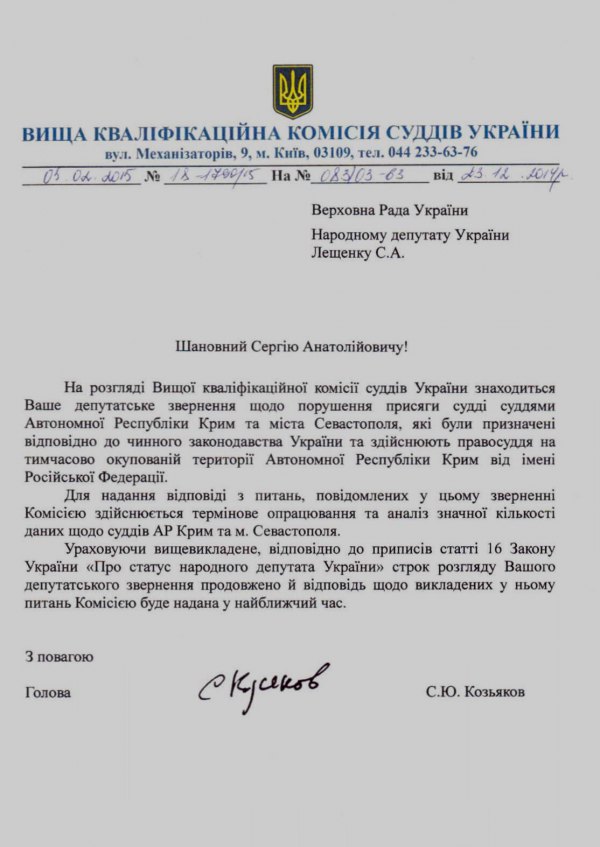 За моїм депутатським зверненням у лютому 2015 року Вища кваліфікаційна комісія суддів перевірила факти щодо переходу кримських суддів на бік Путіна та направила заяву про вчинення кримінального правопорушення до прокуратури та запити до СБУ для ідентифікації осіб.