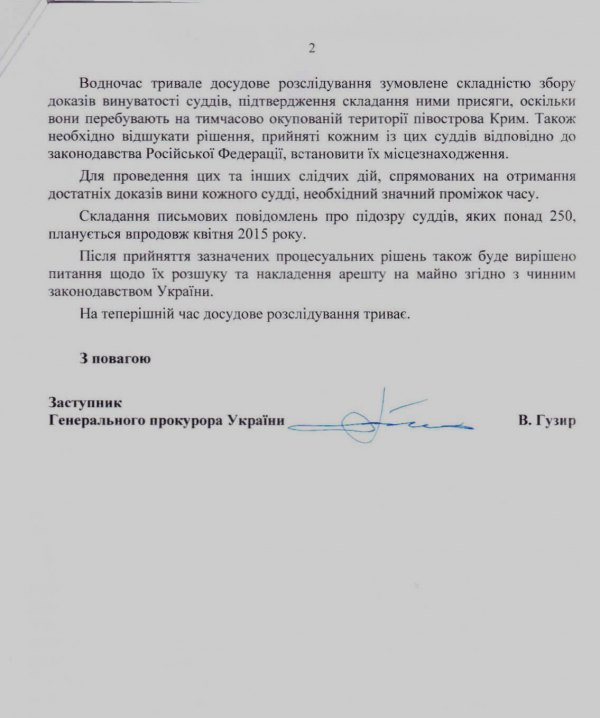 Після неодноразових депутатських звернень Генеральною прокуратурою України 22 травня 2015 року 276 суддям Криму та Севастополя повідомлено про підозру за статтею "державна зрада".