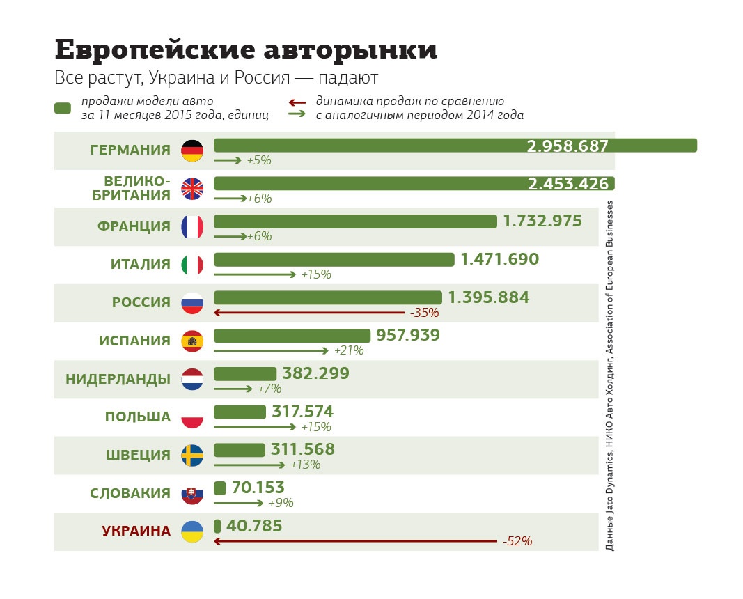Зараз у країні на 1 млн населення продається близько 1 тис. машин, хоча в кращі періоди цей показник досягав 14 тис. Але до європейських лідерів Україна все одно не дотягувала: в Німеччині зараз продається 37 тис. нових машин на 1 млн жителів, у Великобританії — 25 тис.