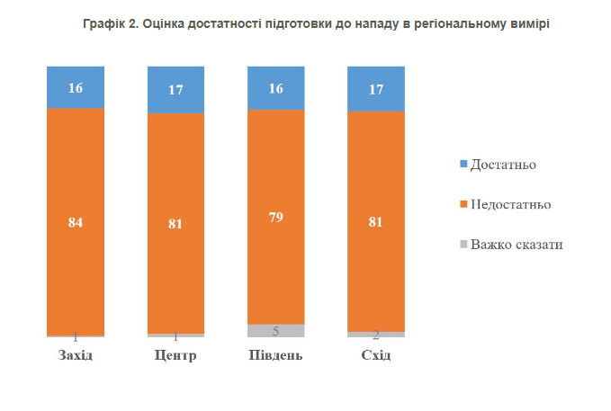З 81% респондентів, які вважають підготовку недостатньою, 44% оцінюють зусилля України як "абсолютно недостатні". Ще 37% заявили, що країна "скоріше доклала недостатніх зусиль". Лише 16% опитаних вважають, що підготовка була достатньою.