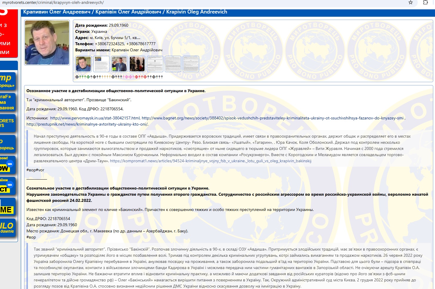 З його змісту випливає: суд "за нововідкритими обставинами" пристав на аргументи сторони "Олега Бакінського" у суперечці, яка тривала понад три роки та походить від датованого 11 липня 2022 року відповідного подання Управління стратегічних розслідувань Нацполіції міста Києва №3253/55/125/01-2022. У його тексті було зазначено, що Крапівін "є одним із лідерів азербайджанського кримінального середовища на території України, який організовує, координує, матеріально забезпечує функціонування злочинних груп, що вчиняють тяжкі та особливо тяжкі злочини на території України". Мовляв, Олег Андрійович планує "прибути до міста Києва, де шляхом підбурення кримінальних елементів, насамперед вихідців з Російської Федерації та близьких їм осіб, планує створити масові протести з метою виправдання проведення військової агресії з боку РФ проти України".