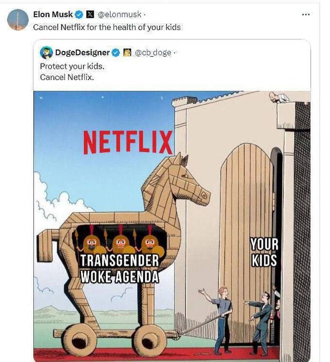 Уточнюється, що таким чином Маск відреагував на публікацію одного з користувачів із зображенням троянського коня з написом «трансгендерний порядок денний», що в’їжджає в замок, на вході до якого вказано «ваші діти».