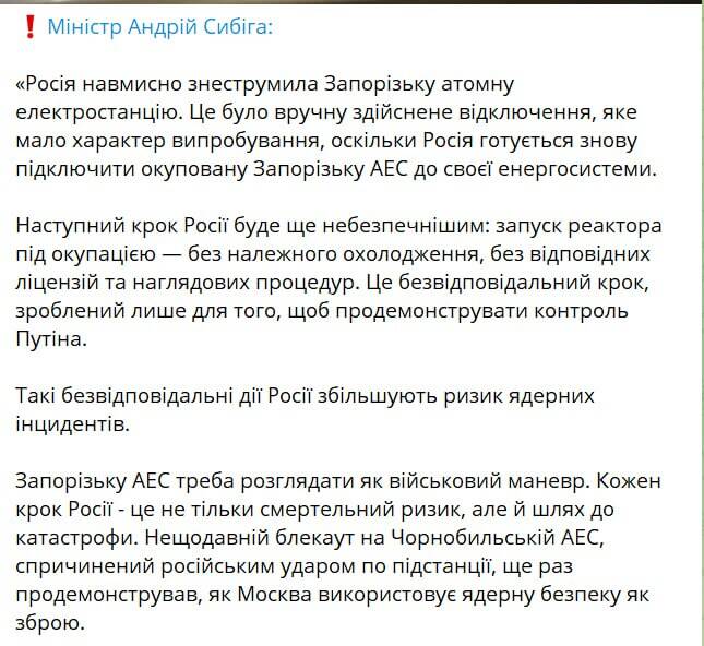 "Наступний крок Росії буде ще небезпечнішим: запуск реактора під окупацією - без належного охолодження, без відповідних ліцензій та наглядових процедур. Це безвідповідальний крок, зроблений лише для того, щоб продемонструвати контроль Путіна", - зазначив Сибіга.