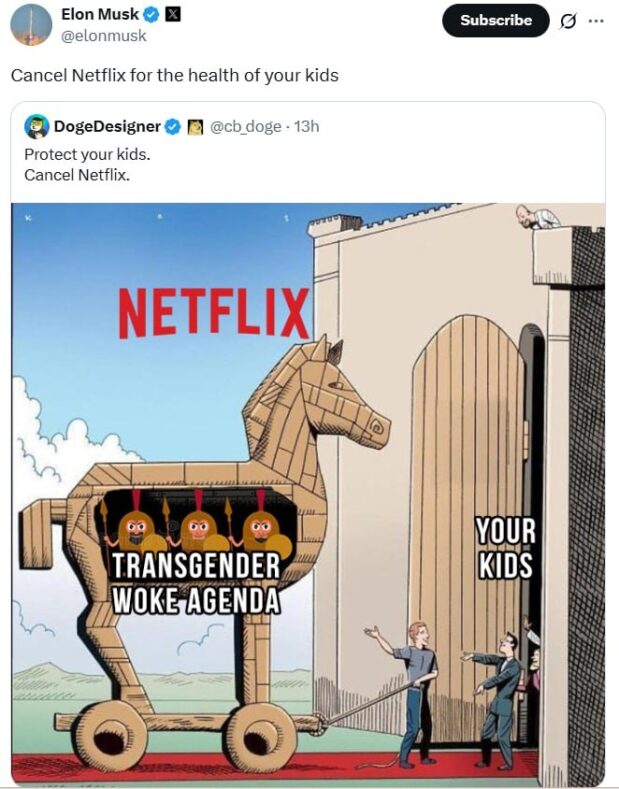 Ілон Маск закликав користувачів соцмережі X відмовитися від Netflix, заявивши, що сервіс просуває неприйнятний дитячий контент. У своєму дописі він написав: «Скасуйте Netflix заради здоров’я ваших дітей».