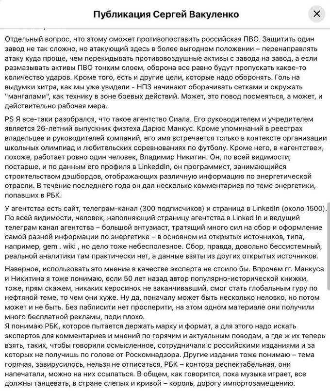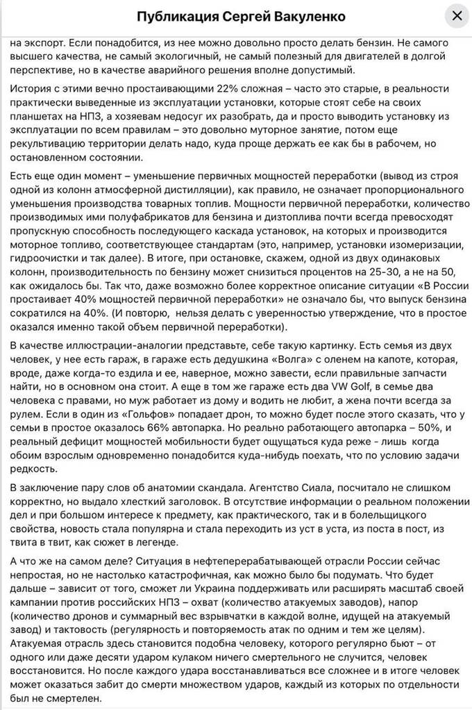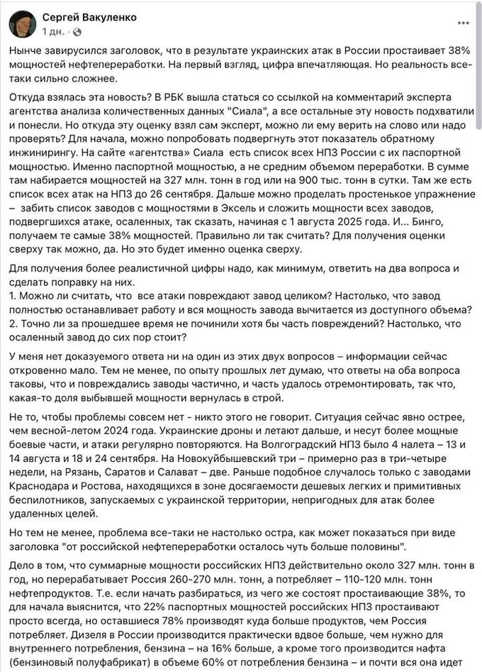 Вакуленко вважає, що «ситуація складна, але не настільки катастрофічна, як могло б здатися з заголовка «Від російської нафтопереробки залишилося трохи більше від половини».
