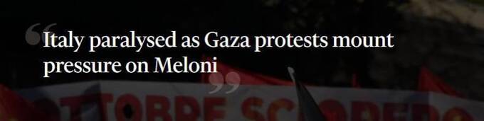 Профспілки оголосили страйк у навчальних закладах, громадському транспорті, на залізницях та в портах. Вони вимагають зупинити наступ Ізраїлю на Газу. У протестах беруть участь десятки тисяч людей, що чинить значний тиск на прем’єр-міністра Мелоні.