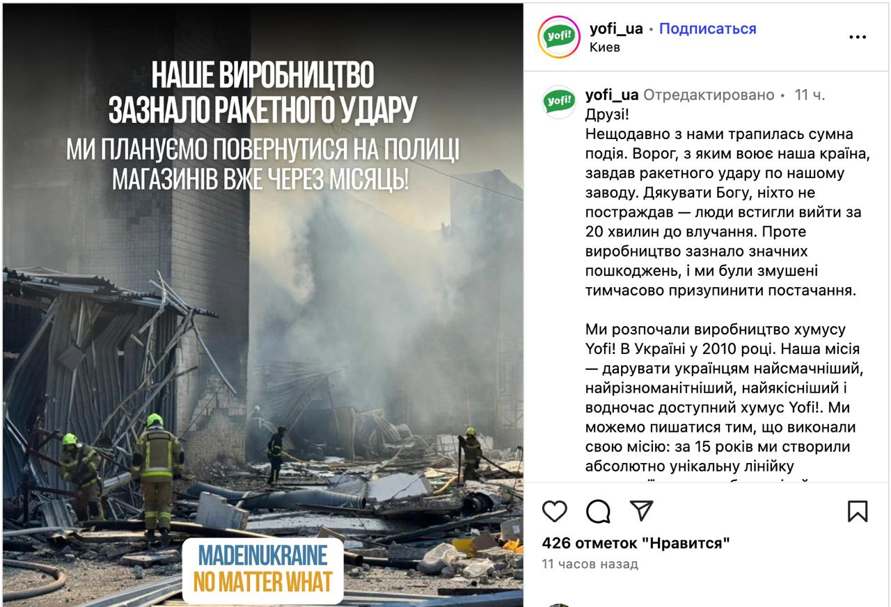 Компанія Yofi, яка займається виробництвом хумусу, оголосила про пошкодження свого заводу, в результаті чого постачання продукції будуть призупинені щонайменше на місяць.