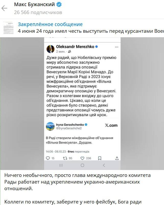 На тлі невдоволення Білого дому через те, що Трампу не вручили Нобелівську премію миру, голова Комітету Верховної Ради з міжнародних справ, депутат від «Слуги народу» Олександр Мережко висловив свою радість з приводу отримання премії венесуельською опозиціонеркою.