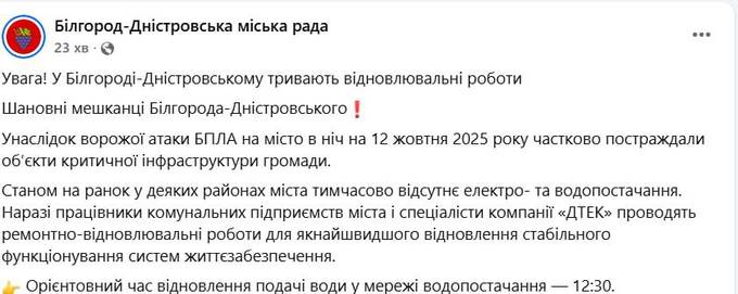 У результаті нічних атак безпілотників електропостачання частково відсутнє в Білгород-Дністровському Одеської області.