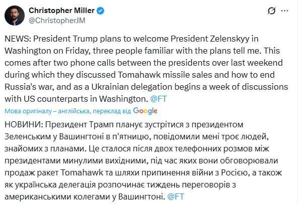 За даними журналіста, зустріч Трампа та Зеленського відбудеться у п’ятницю, 17 жовтня, у Вашингтоні.