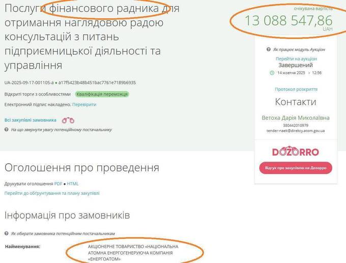 Державне підприємство "НАЕК "Енергоатом" оголосило тендер на закупівлю послуг фінансового радника для своєї Наглядової ради, що викликало значний інтерес через високу очікувану вартість.