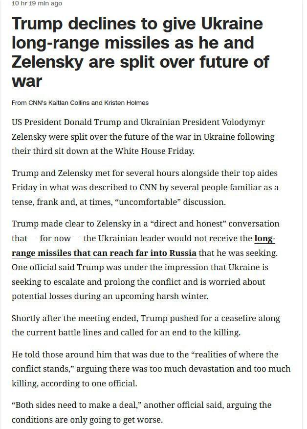 "Під час прямого та відвертого діалогу Трамп чітко дав зрозуміти Зеленському, що доти, поки український лідер не отримає запитувані ракети великої дальності, здатні досягати найбільш віддалених районів Росії. Один із чиновників зазначив, що у Трампа склалося відчуття, що Україна прагне до ескалації та затягування ситуації", - пише видання.