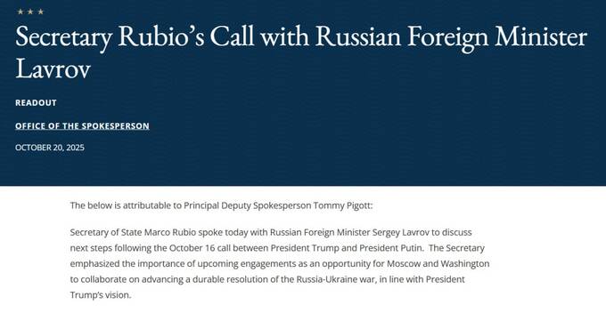 Держдеп США також оголосив про телефонну розмову між держсекретарем Рубіо та міністром закордонних справ Росії Лавровим.