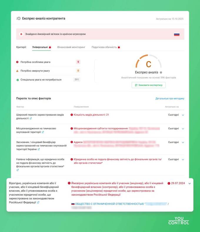 Крім прямої участі фізичних та юридичних осіб з росії, ще три компанії з досліджуваної вибірки мають ймовірні опосередковані зв’язки з росією, а саме участь їхніх учасників/кінцевих бенефіціарних власників/представників в статутному капіталі російських юридичних осіб. До прикладу, керівник ТОВ "ТВФ "Альфа" Олексій Запорожченко ймовірно є учасником російського ООО "Голд Кэпитал". Інформація про таку ймовірну пов’язаність із країною-агресоркою відображена в “Експрес-аналізі” системи YouControl.