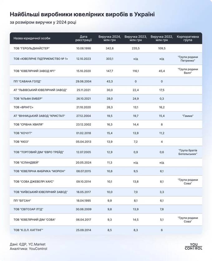 За даними YC.Market, 622 юридичні особи та 855 ФОПів мають основний вид економічної діяльності 32.12 “Виробництво ювелірних і подібних виробів”. Переважна їх частина зосереджена у столиці. У 2024 році виторг виробників ювелірних і подібних виробів зросла у 1,5 раза порівняно з 2023-м. Лідером за виторгом стало ТОВ “Герольдмайстер”, що отримало 342,6 млн грн. У структурі власності 71 компанії присутні фізичні та/або юридичні особи з 25 країн світу. Найбільше підприємств мають співвласників із Туреччини, Узбекистану, Ізраїлю, росії та Молдови.