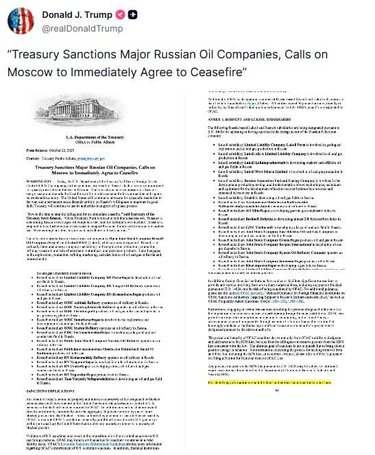 "Негайно припинити вогонь": Трамп оголосив про санкції США проти найбільших нафтових компаній Росії