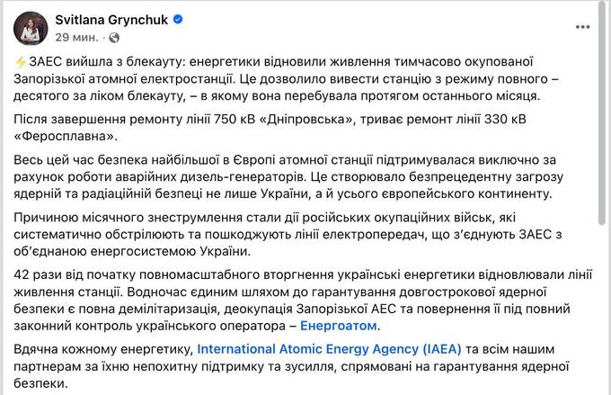 Нагадаємо, 23 вересня були пошкоджені лінії електропередач, через що ЗАЕС опинилася відрізаною від зовнішнього електропостачання і перейшла на живлення від дизель-генераторів, що створювало ризики безпеки для роботи станції.
