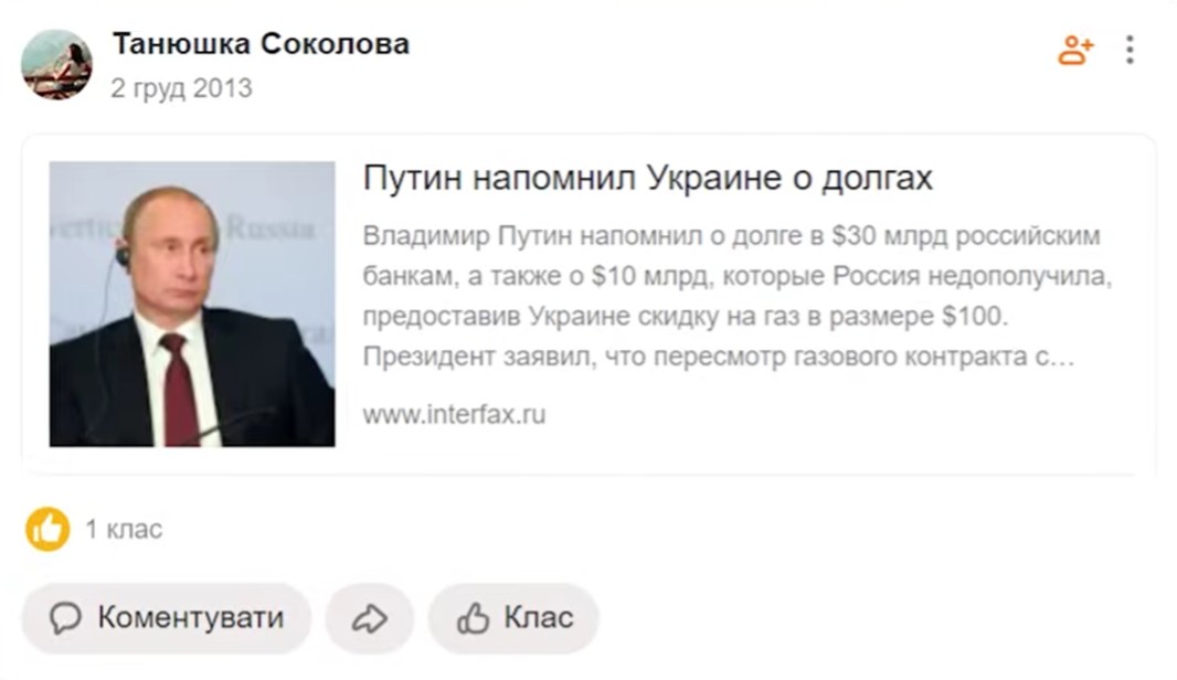 Сторінка в “однокласніках” дружини поліцейського Тетяни Соколової рясніє проросійськими дописами: від георгіївських стрічок, “я помню – я горжусь” до “рускіє войну нє начіналі” та виправдовувань беркута у 2014 році.