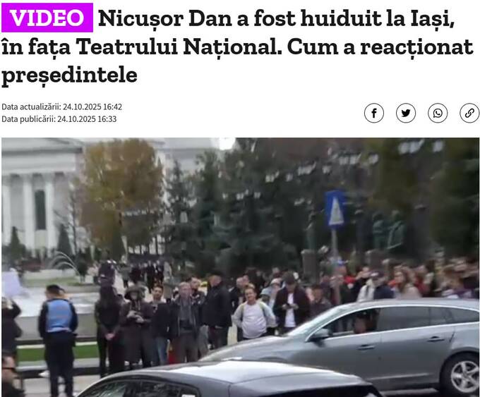 Згідно з даними видання, у місті Ясси президента Румунії Нікушора Дана зустріла група з кількох десятків протестувальників, які висловлювали невдоволення його позицією на підтримку України.