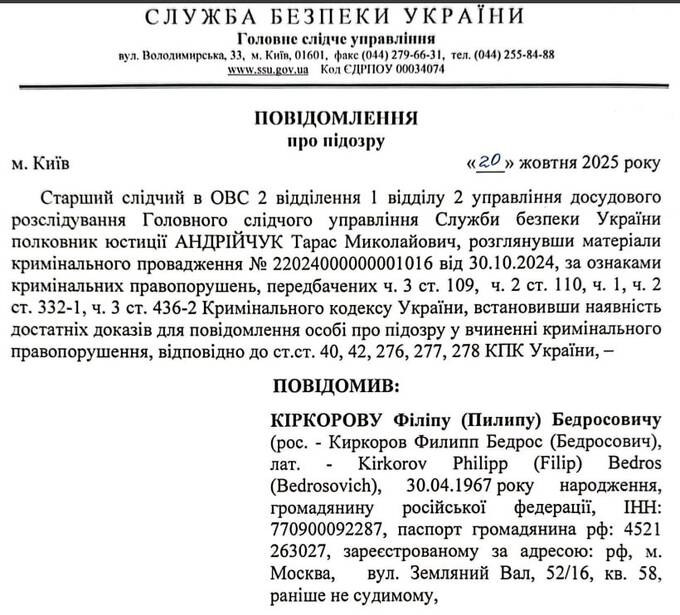 СБУ висунула обвинувачення Філіппу Кіркорову за підтримку війни в Україні та анексії Криму, а також за регулярні виступи на окупованих територіях перед російськими військовослужбовцями.