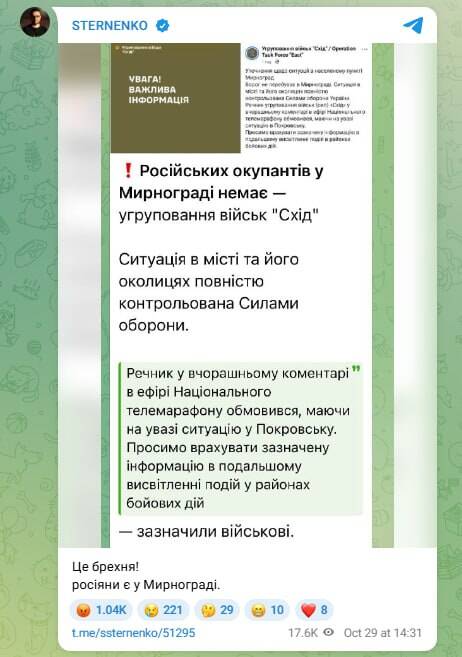 Відомий український волонтер Сергій Стерненко заявив, що інформація про відсутність російських військових у Мирнограді є "брехнею", оскільки окупанти вже проникли в місто. Його попередні заяви також вказували на критичну ситуацію, де "Покровськ і Мирноград практично в оточенні".