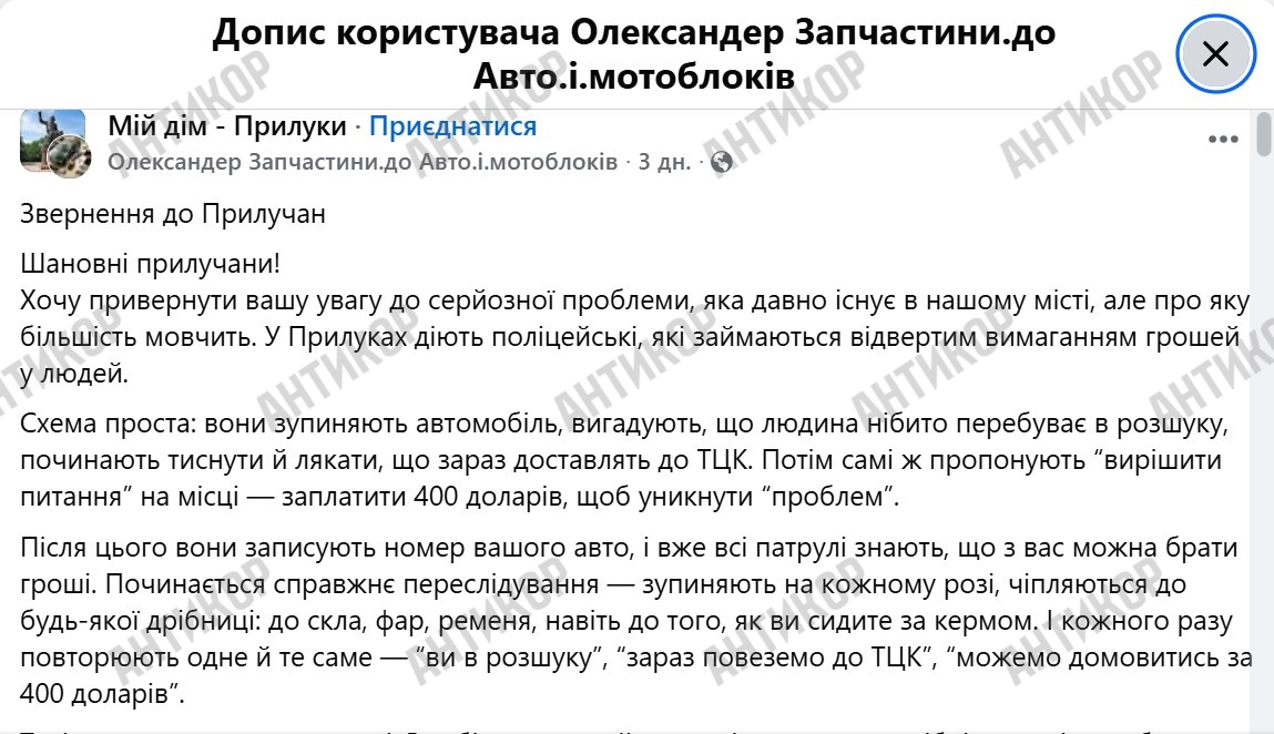 У соцмережах оприлюднено допис, у якому двох співробітників Прилуцького районного відділу поліції Чернігівської області звинувачують у рекеті під прикриттям виконання мобілізаційних завдань.